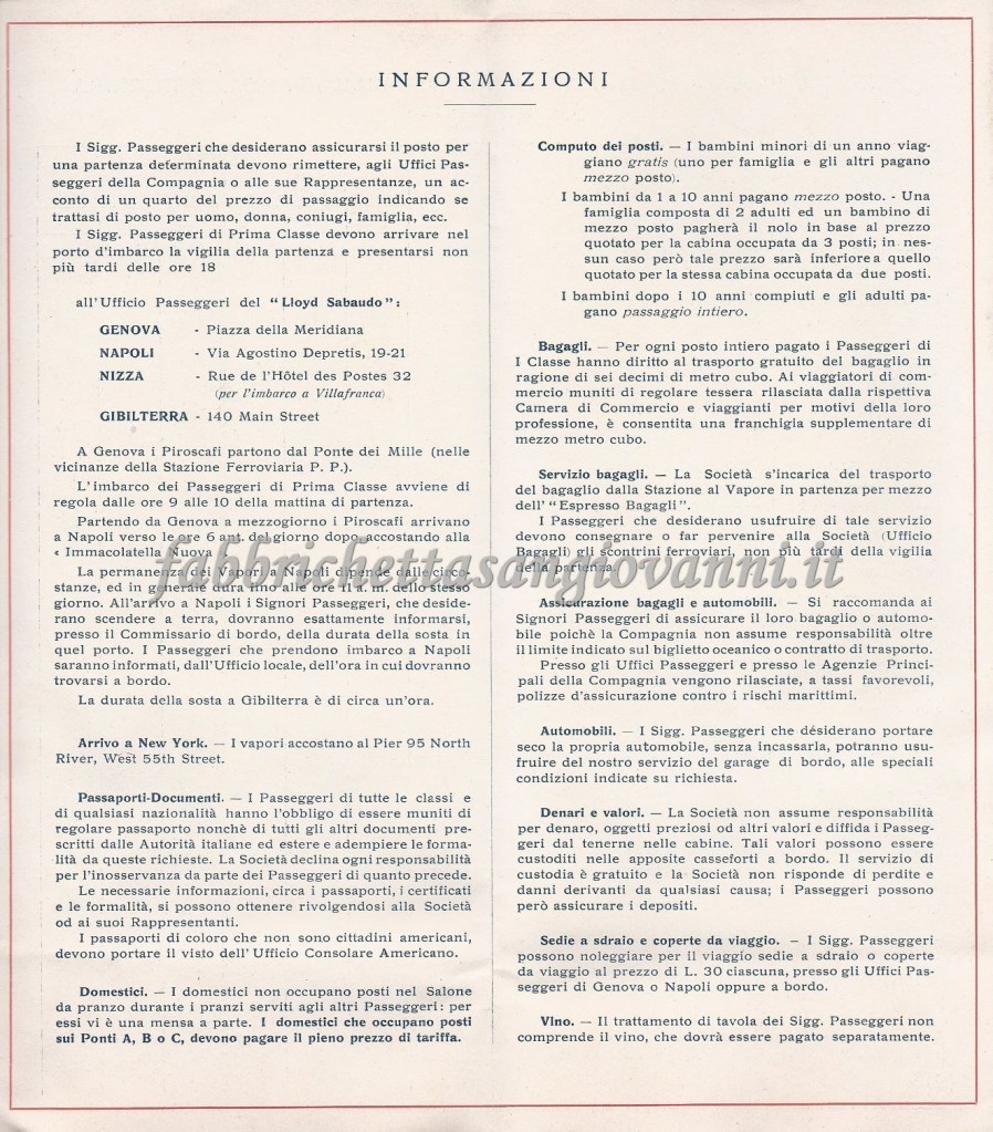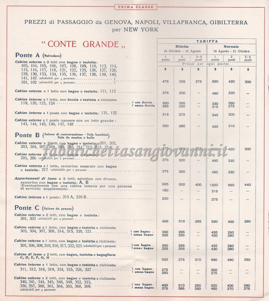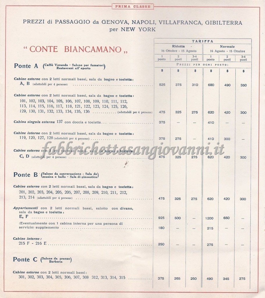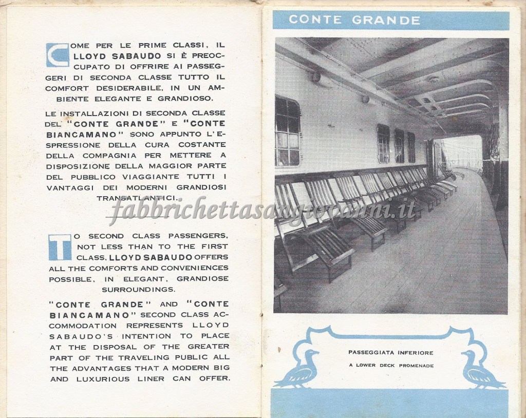 Depliant con i prezzi e le informazioni di viaggio della prima classe. Successivamente, forse per ragioni economiche, scelse la seconda classe.