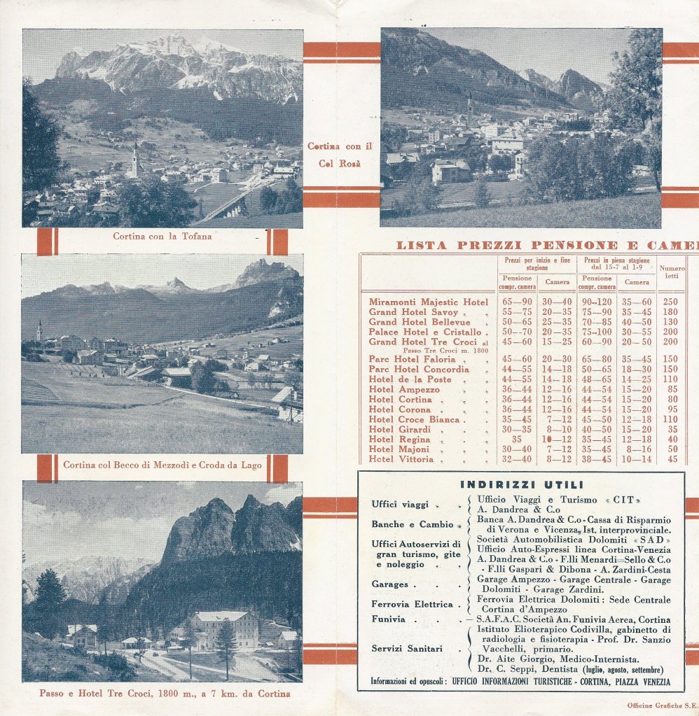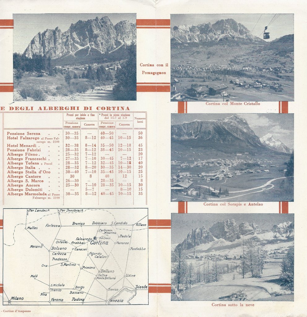 Cerchiamo un albergo e partiamo con la nostra Fiat 509 per Cortina, per passare il ferragosto al fresco delle montagne.
