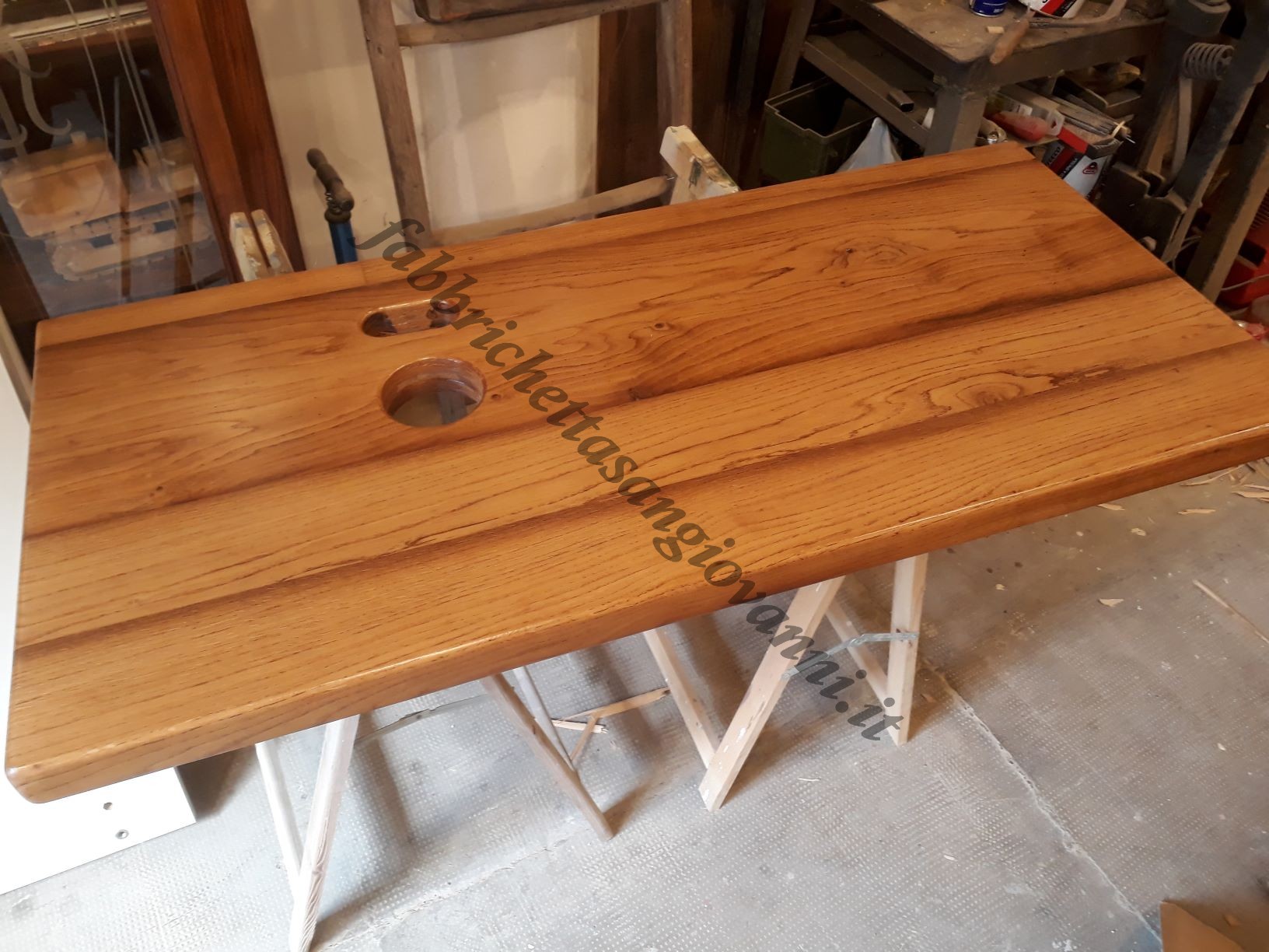 In questo progetto abbiamo riutilizzato delle vecchie travi di rovere del cliente trasformandole in due piani per lavabo.